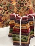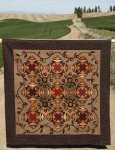 Autumn Sunset Kit by Janet Rae Nesbitt of One Sister Beautiful Patchwork quilt using the vibrant & rich colors of a sunset. Pattern is in the Down the This Country Road book, purchased separately. Kit includes the cotton fabric for patchwork, borders and binding, and the wool for the appliques. Tri-Recs ruler set or equivalent is required. Use the dropdown arrow to add the book and/or ruler set to your order.
